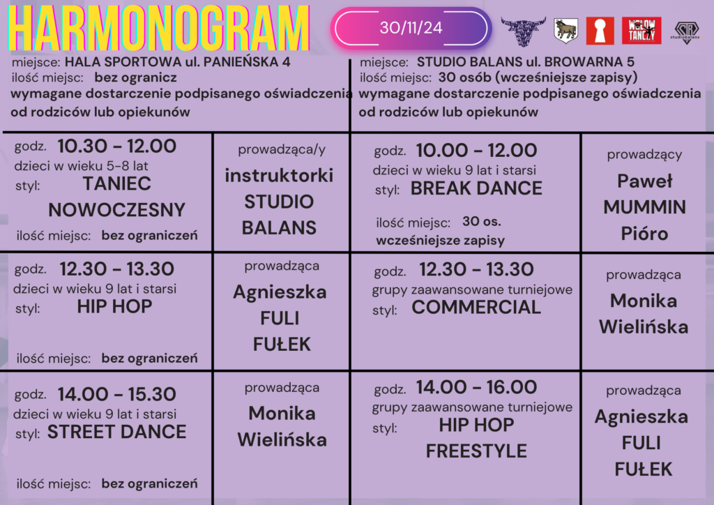 Poniżej przedstawiamy HARMONOGRAM BEZPŁATNYCH WARSZTATÓW TANECZNYCH organizowanych przez Stowarzyszenie ZBALANSOWANI przy współpracy ze Studiem Balans. Warsztaty są prezentem od Burmistrza gminy Wołów Dariusza Chmury w ramach prezentu dla dzieci i młodzieży z gminy Wołów (i nie tylko). Zapraszamy do wzięcia udziału !